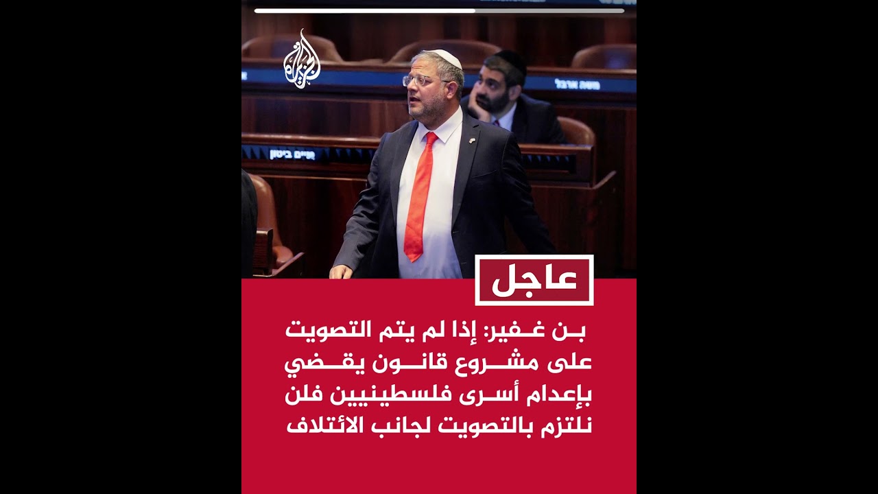 بن غفير: إذا لم يتم التصويت على مشروع قانون يقضي بإعدام أسرى فلسطينيين فلن نلتزم بالتصويت للائتلاف  #AlJazeera Arabic # قناة الجزيرة