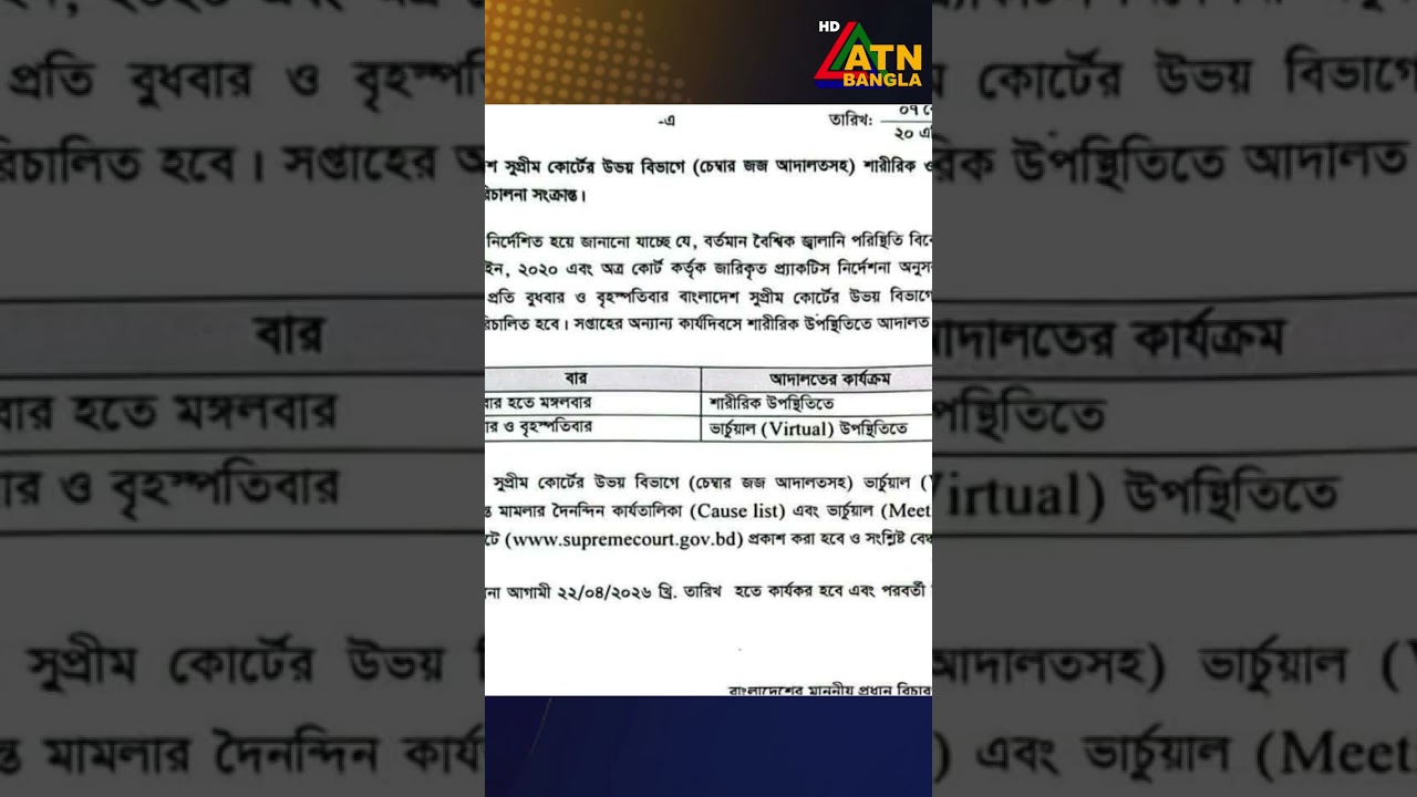 সপ্তাহে দুইদিন বুধ ও বৃহস্পতিবার সুপ্রিমকোর্টের উভয় বিভাগে ভার্চুয়ালি বিচারকাজ চলবে। #ATNBanglaNews