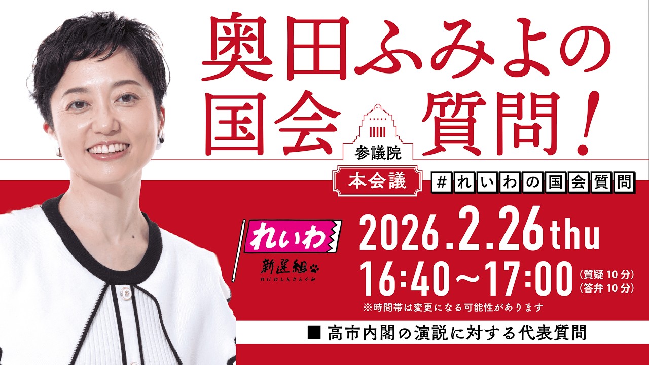 #れいわ新選組 【LIVE!】参議院 本会議 奥田ふみよの国会質問!(2026年2月26日 16時40分~)