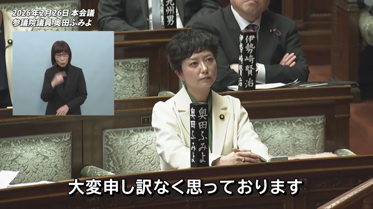 奥田ふみよ 【参議院本会議 代表質問】 2026年2月26日 字幕入りフル