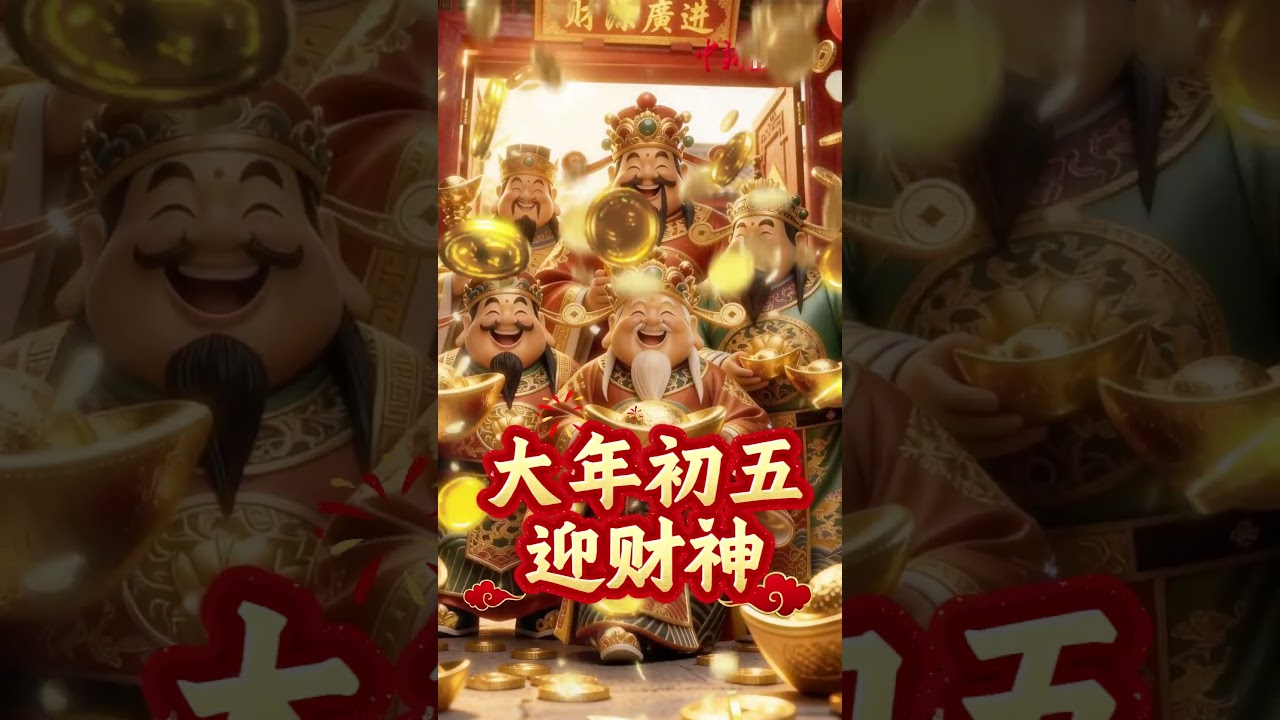 今年是大年初五,初五迎财神!五路财神祝大家财源滚滚来,祥瑞天天绕!#财神 #发财 #大年初五迎财神#祝福 #春节 #中国新闻社