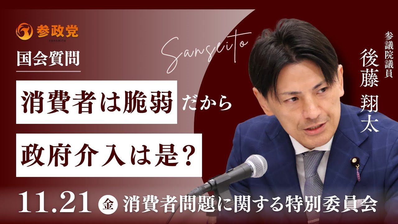 #参政党 【国会中継】16:20〜「消費者は脆弱、だから政府介入は是?」参議院議員 後藤翔太 国会質疑 令和7年11月21日 参政党