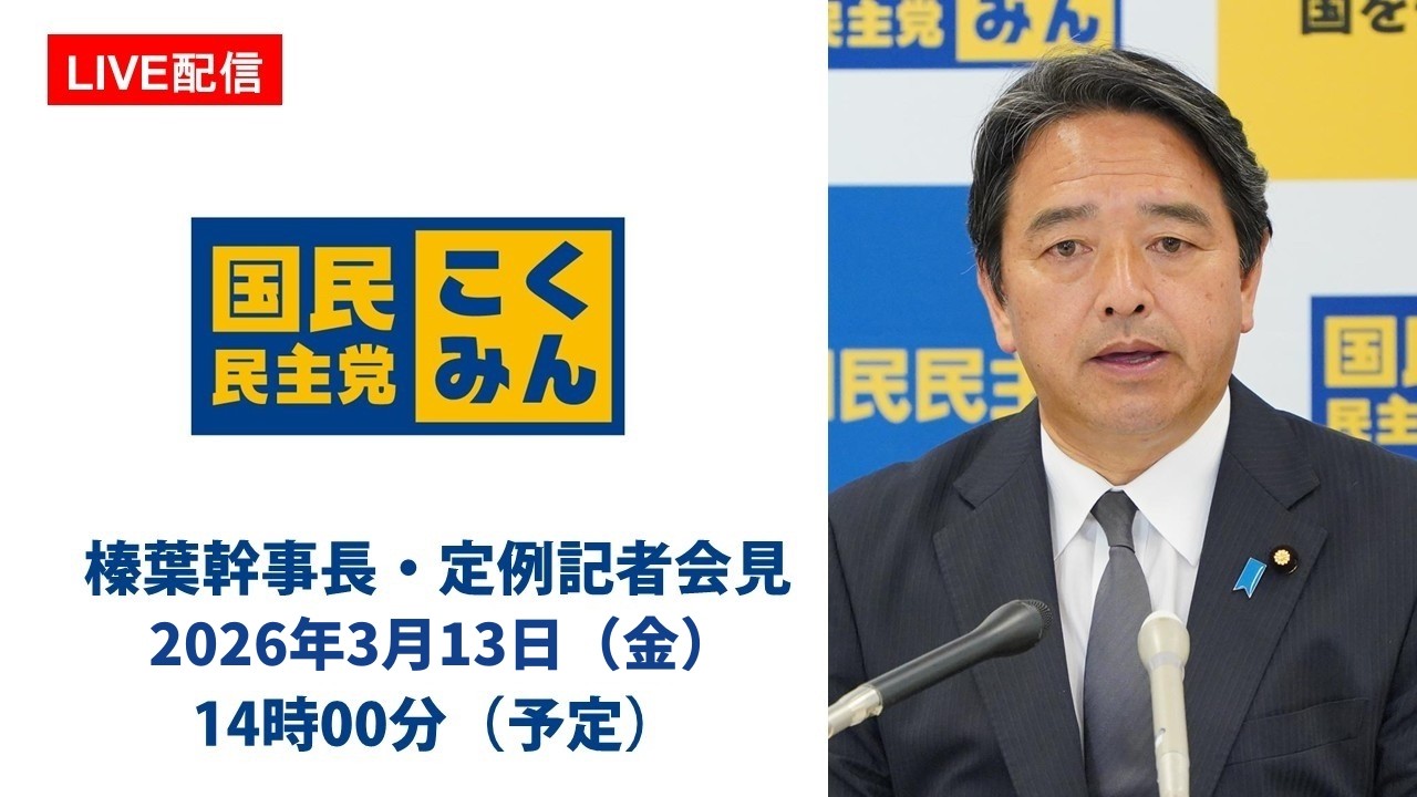 #国民民主党 【LIVE配信】国民民主党・榛葉幹事長会見 2026年3月13日(金)14時00分(予定)