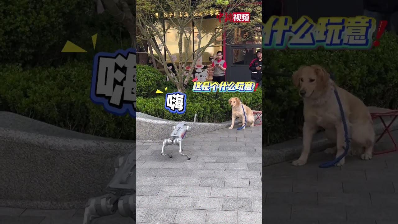 #当小金毛遇到机器狗 吓出表情包 #搞笑 #狗狗 #中国新闻社