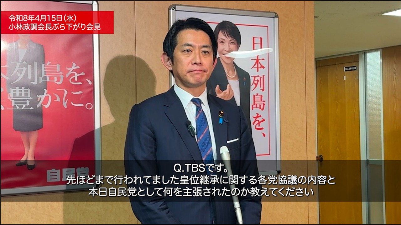 令和8年4月15日(水)、安定的な皇位継承に関する全体会議終了後、小林鷹之政調会長が自民党本部でぶら下がり会見を行いました。