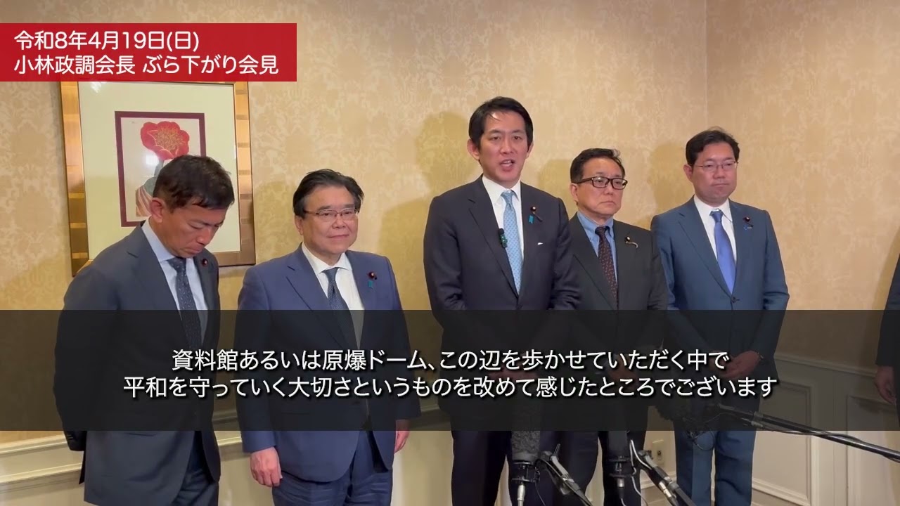 令和8年4月19日(日)、移動政調会が広島県で行われ、小林鷹之政務調査会長が記者会見を行いました。