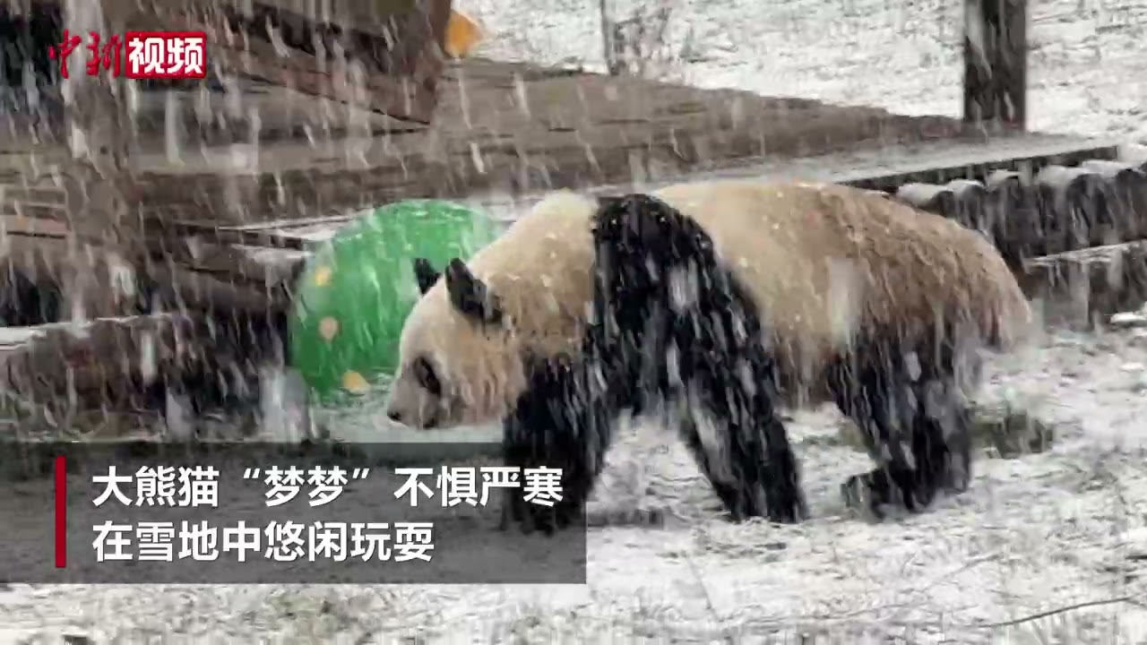 2月23日,陕西西安。漫天飞雪为秦岭野生动物园增添诗意,大熊猫“梦梦”不惧严寒,在雪地中悠闲玩耍,宛如灵动的“雪团子”。(党田野 视频来源:秦岭野生动物园)