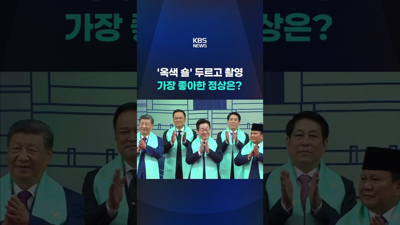 이재명 대통령을 비롯한 21개국 정상들이 지난 1일, 경주 화백 컨벤션센터에서 열린 2025 APEC 폐막식에서 옥색 숄을 두른 채 단체 사진을 촬영했습니다.