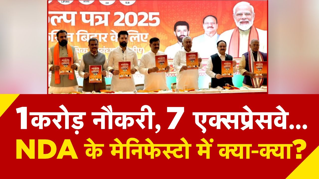 The dates for the first phase of Bihar elections are nearing, and the NDA has released its manifesto. The NDA manifesto promises 5 million pucca houses, free rations for the poor, and one crore government jobs and employment opportunities for the youth of Bihar.आजतक के साथ देखिये देश-विदेश की सभी महत्वपूर्ण और बड़ी खबरें | Watch the latest Hindi