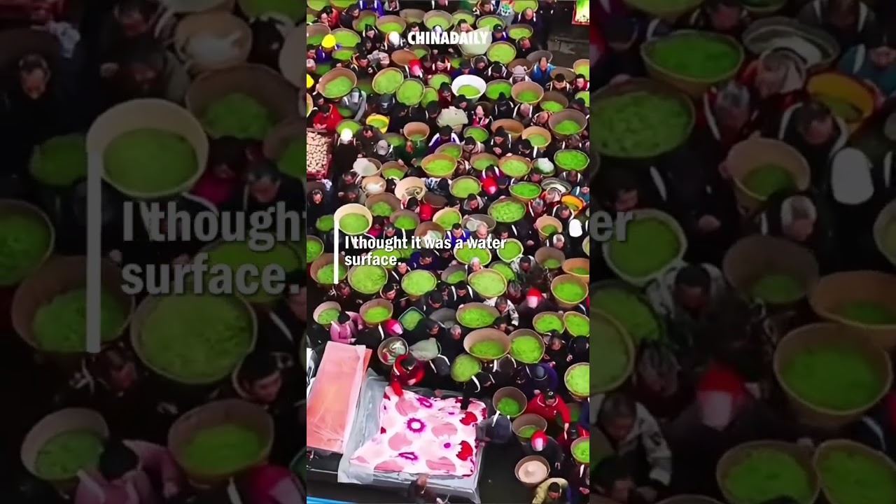 An aerial view captures tea farmers flocking to the market, flowing through the gates like patches of duckweed drifting with the currents. #China #tea #FunChina