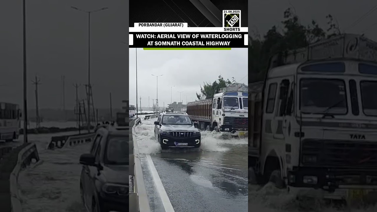 #ANINews Drone visuals show waterlogging at Gujarat’s Somnath Coastal Highway after incessant rainfall