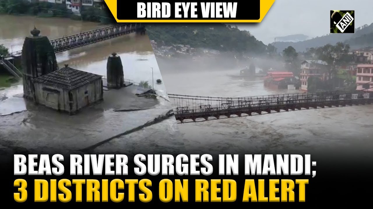#ANINews WATCH! Drone captures visuals of Beas river surge in Mandi, Chamba, Kangra & Mandi on red alert