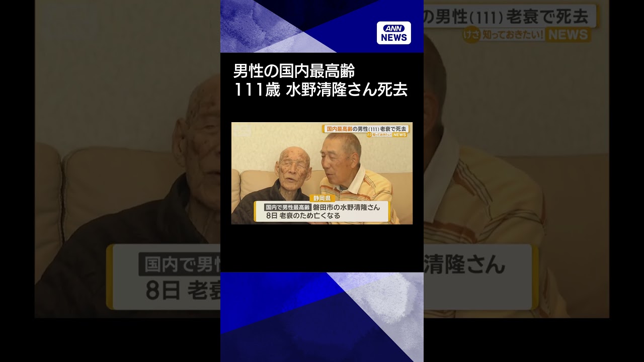 #ANNnews 【ニュース】国内最高齢男性・水野清隆さん(111)が老衰で死去 長生き秘訣は「物事苦にしない」 #shorts