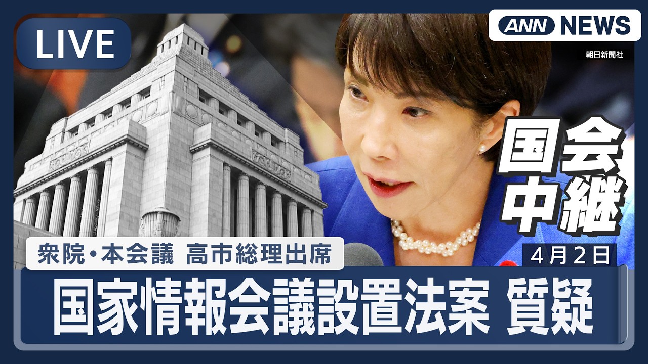 #ANNnews 【国会ライブ】衆議院 本会議|高市総理出席 国家情報会議設置法案 質疑【LIVE】(2026年4月2日) ANN/テレ朝