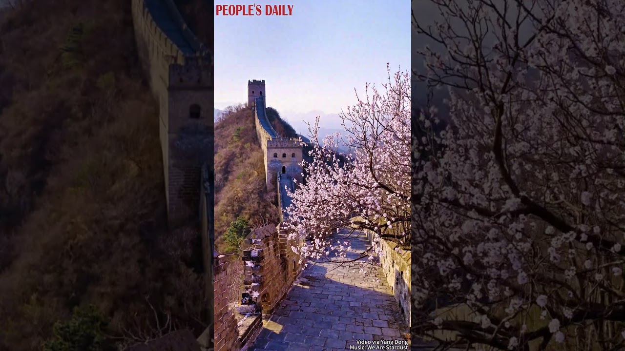 Apricot blossoms dot the Jinshanling section of the Great Wall in north China #PeoplesDailyChina #人民日报