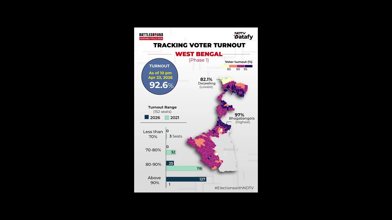 West Bengal records a massive 92.6% voter turnout in Phase 1 of the 2026 Assembly polls as of 10 pm, underlining intense electoral participation. Bhagabangola leads with a striking 97% turnout, while Darjeeling records the lowest at 82.1%. A dominant 127 constituencies cross the 90% mark, reflecting a high-stakes, high-energy contest across the state.