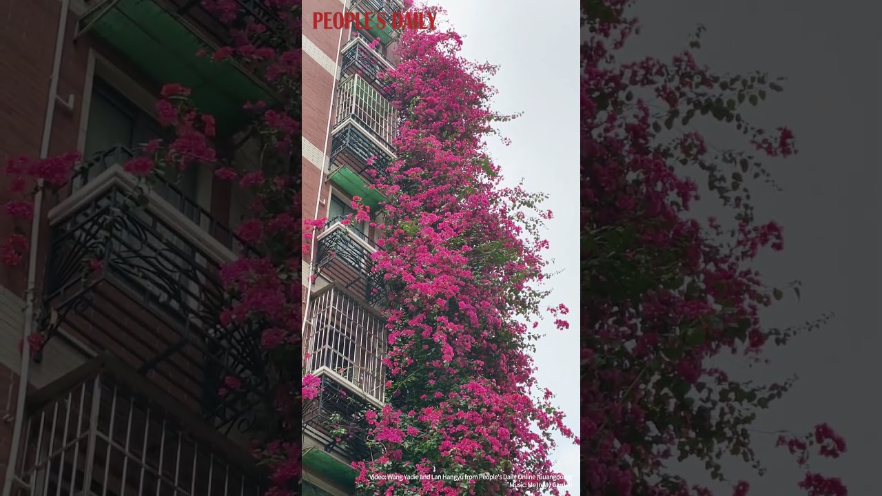 Bougainvillea flowers cascade down a residential building wall in Guangzhou #PeoplesDailyChina #人民日报