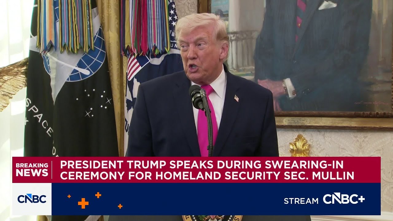 President Trump delivers remarks following the swearing-in ceremony for Homeland Security Markwayne Mullin.