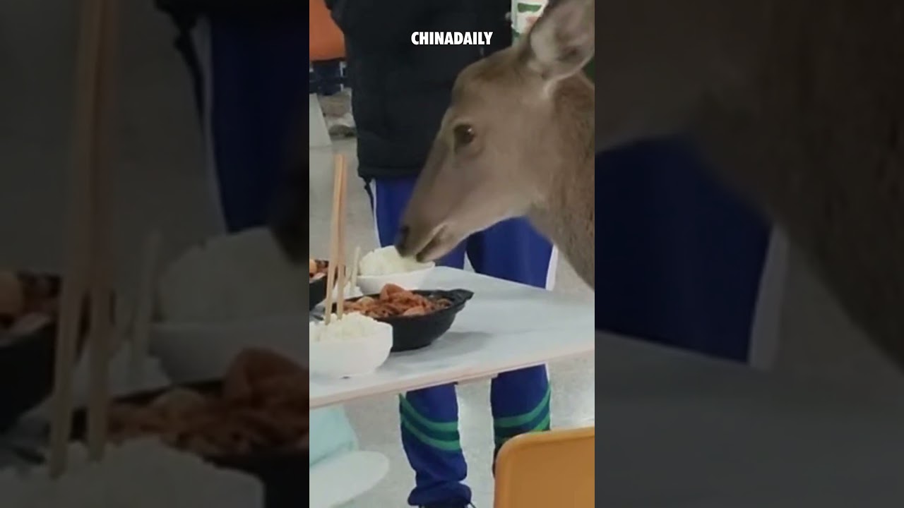 Deer crashes school canteen for a surprise meal! #ChinaDaily #中国日报