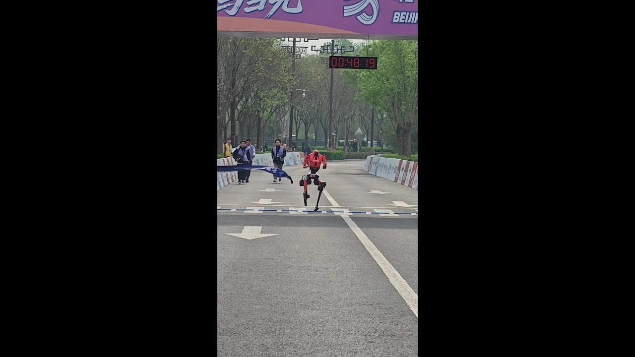 A humanoid robot, competing in the remote-controlled category, from Team Honor has just crossed the finish line at the Beijing E-Town humanoid robot half-marathon. #Beijing #marathon #humanoidrobot
