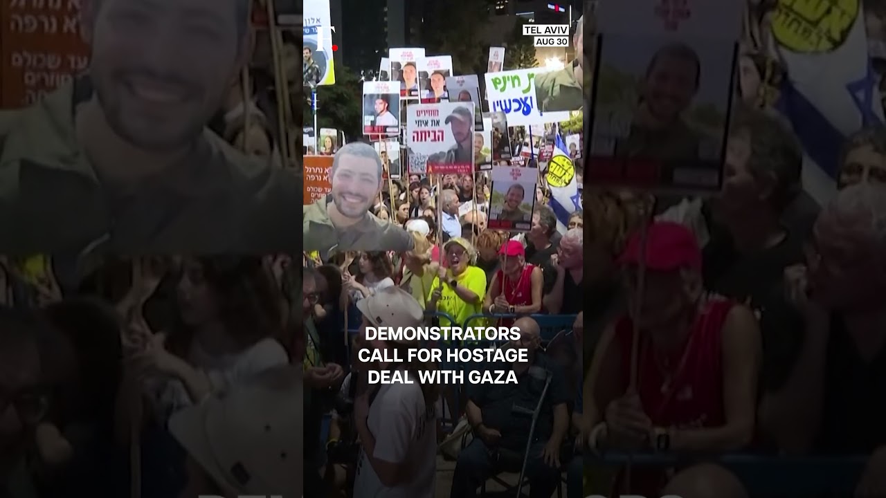 Israeli protesters gather at Hostages Square in Tel Aviv, demanding a deal for the release of all hostages in Gaza. Families accuse Prime Minister Benjamin Netanyahu of prioritising the military offensive over bringing hostages home, despite claiming a deal exists. Protesters unveil a large banner urging Trump to “make history” with a hostage deal. Drone footage shows thousands rallying, waving flags and banners, as Israel confirms 49 hostages remain, with only 20 believed alive.