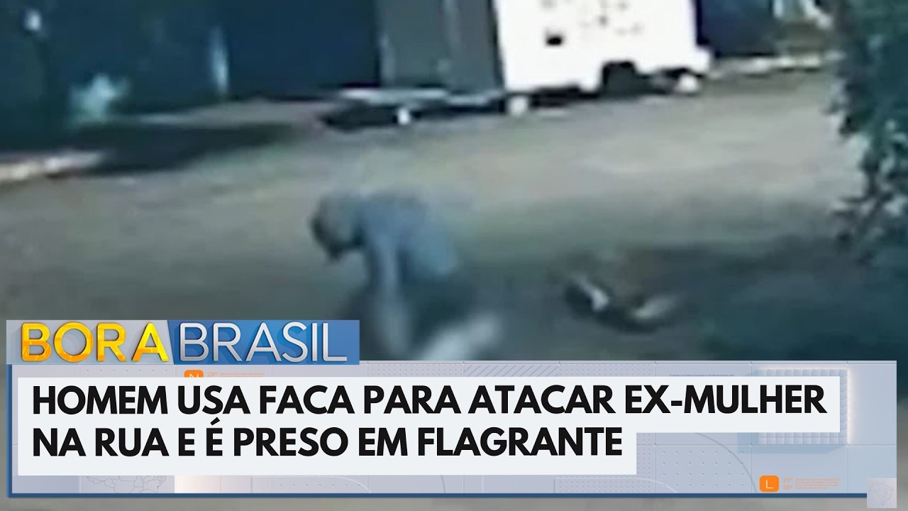 Um homem usou uma faca pra atacar a a ex-mulher na rua foi preso em flagrante. Câmeras de segurança flagraram o momento em que ele sai de trás de um arbusto e ataca a vítima.