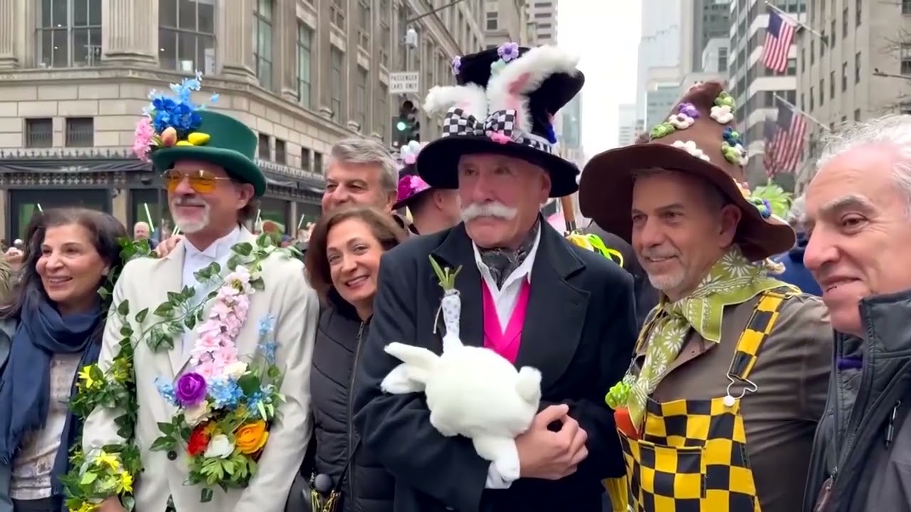 Crowds gathered in festive attire for New York’s Easter Parade, showcasing traditional outfits and creative costumes, including pets dressed up for the occasion.