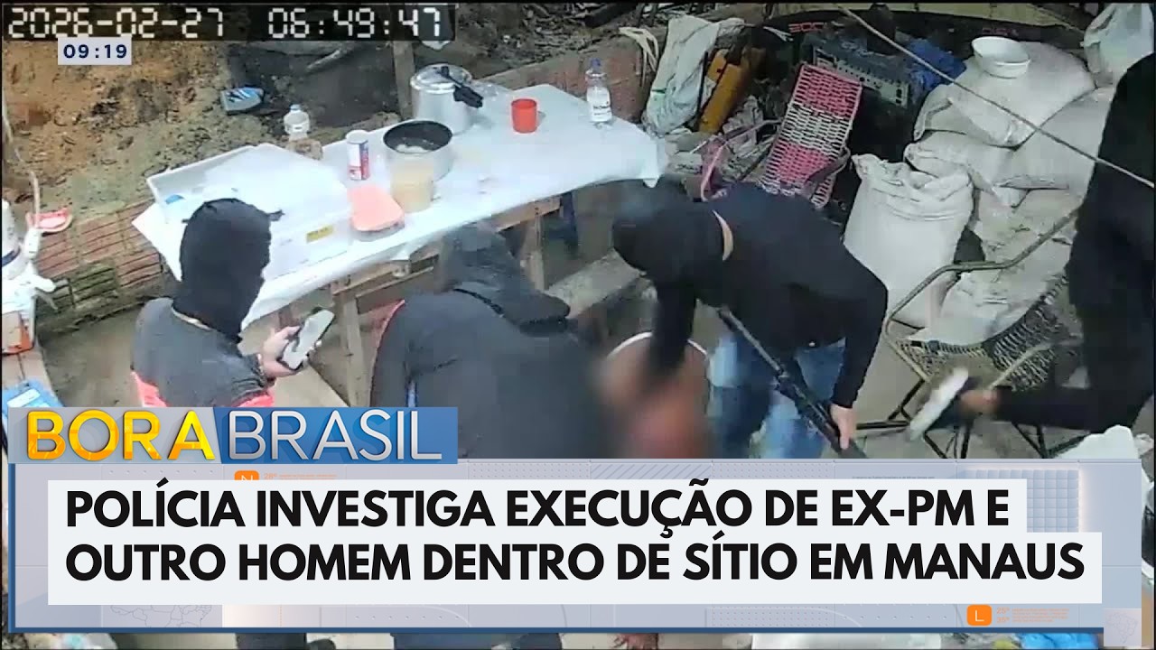 A polícia investiga a execução de ex-PM e outro homem dentro de sítio em Manaus. Imagens de câmeras de segurança flagraram o momento em que eles são rendidos por quatro bandidos encapuzados e armados com fuzil.