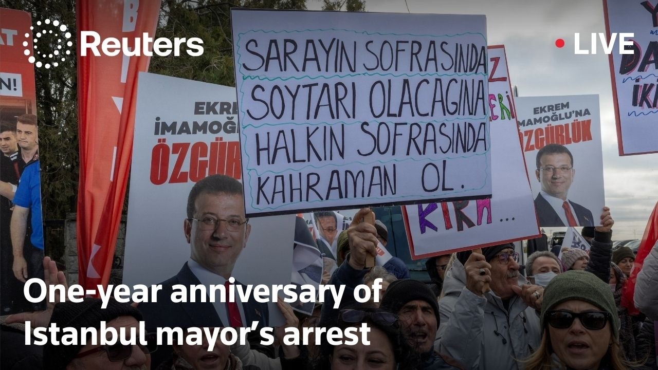 Supporters in Istanbul mark one year since Mayor Ekrem Imamoglu’s arrest, days after the jailed opposition figure went on trial on corruption charges critics call politically motivated.