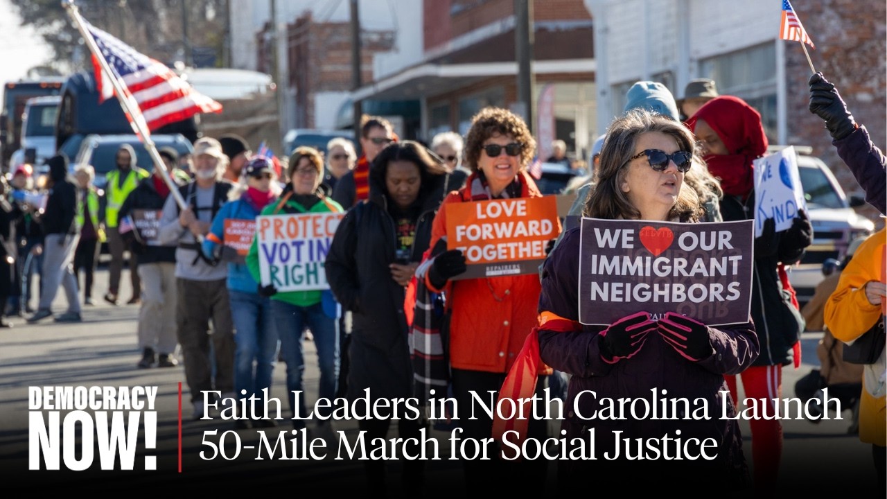 Faith leaders in North Carolina are leading a three-day trek from Wilson to Raleigh in an event aimed at supporting “unabridged voting rights; living wages and ending poverty; welcoming immigrants,” and more. Reverend Jonathan Wilson-Hartgrove spoke with _Democracy Now!_ from the march, saying that “love is the power that can overcome fear in this moment.” As North Carolina faces a President Trump-led gerrymandering effort, Wilson-Hartgrove hopes that the event will mobilize voters across the state.