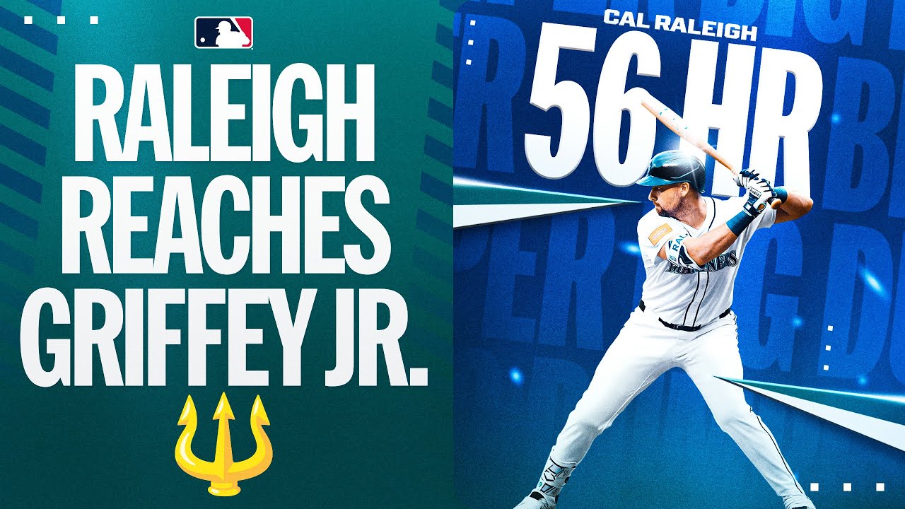 Cal Raleigh slams his second home run of the game and his 56th homer of the season, tying Ken Griffey Jr.’s franchise record with the Mariners.