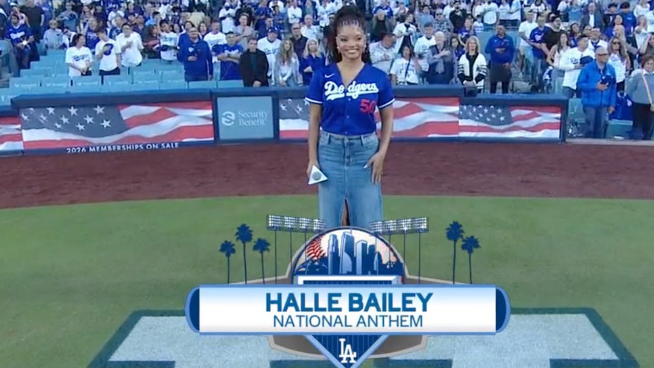 Halle Bailey sings the National Anthem prior to Game 4 of the National League Championship Series between the Milwaukee Brewers and Los Angeles Dodgers on October 17, 2025.