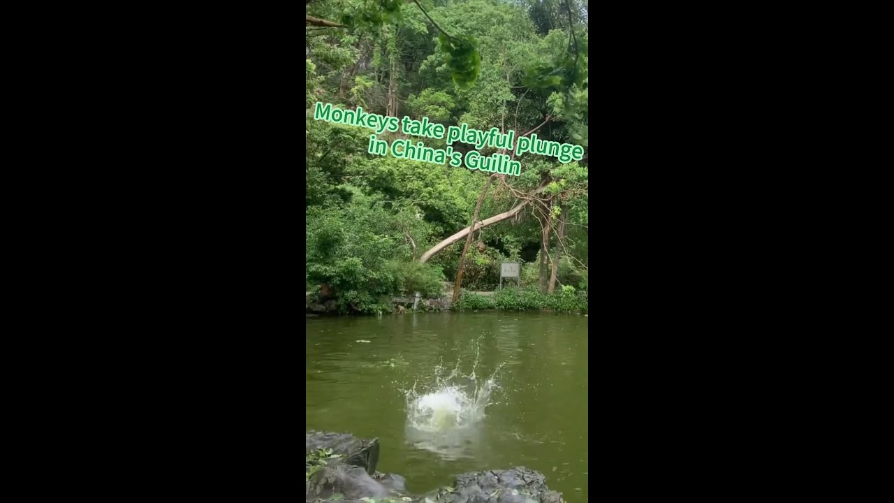 Monkeys jump into the water one after another in south China’s Guilin, drawing cheers and laughter from visitors. #China #Guilin #monkey