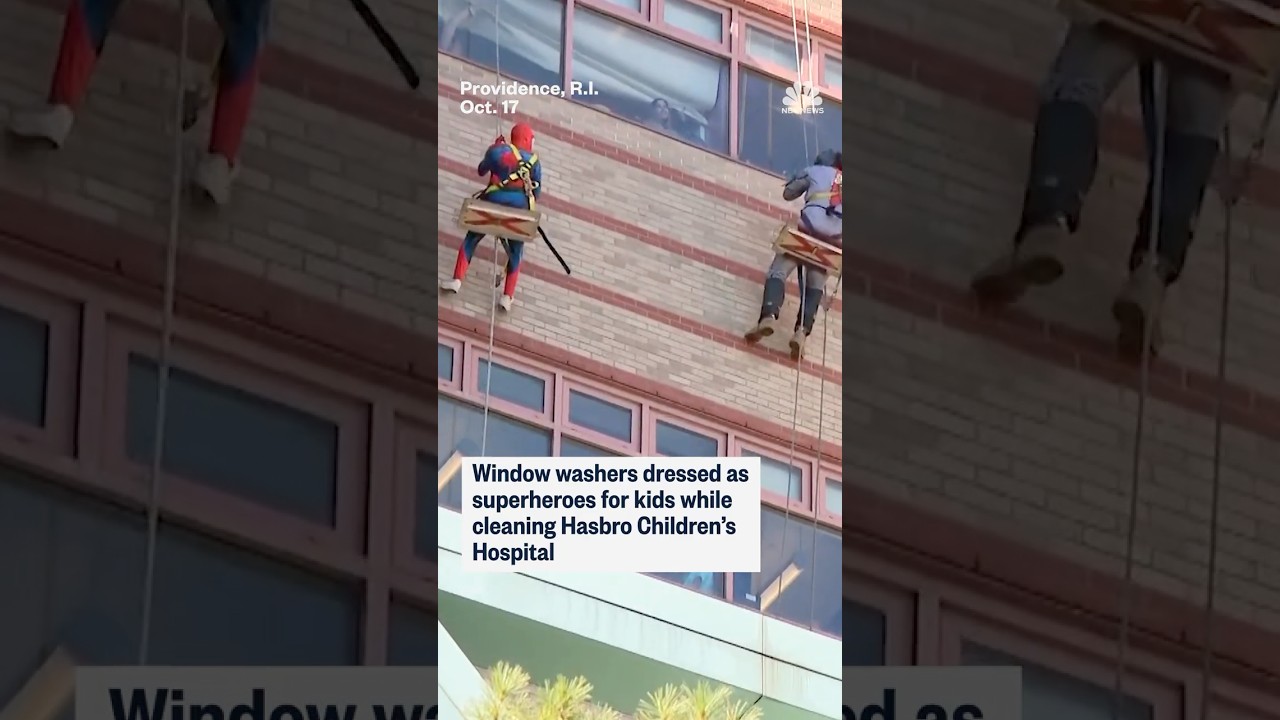 #NBC Window washers dressed as superheroes for kids while cleaning Hasbro Children’s Hospital