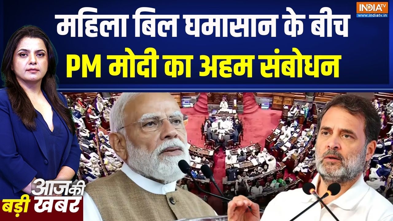 लोकसभा में विपक्ष ने महिला आरक्षण बिल को गिरा दिया…जिसके बाद संसद से लेकर सड़क तक संग्राम मचा है… BRK IN_महिला आरक्षण पर छिड़े घमासान के बीच प्रधानमंत्री नरेंद्र मोदी आज राष्ट्र को संबोधित करने वाले हैं… पीएम मोदी आज रात साढ़े 8 बजे राष्ट्र को संबोधित करेंगे..इस दौरान पीएम मोदी कोई बड़ा ऐलान कर सकते हैं… प्रधानमंत्री अपने संबोधन में देश की महिलाओं को बड़ा मैसेज दे सकते हैं.. महिला आरक्षण संशोधन बिल पर अपनी बात रख सकते हैं…और बिल गिरने पर जश्न मना रहे लेकर विपक्ष को एक्सपोज कर सकते हैं…