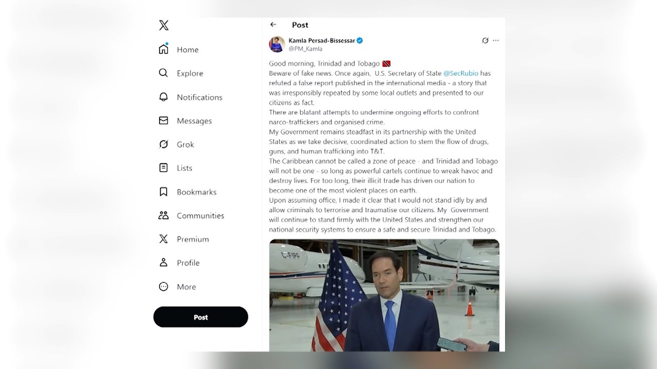 In a post on her X account, Mrs. Persad-Bissessar noted that US Secretary of State Marco Rubio has since refuted the claims that the United Kingdom has stopped sharing intelligence on drug-trafficking vessels over concerns about military strikes in the Caribbean.