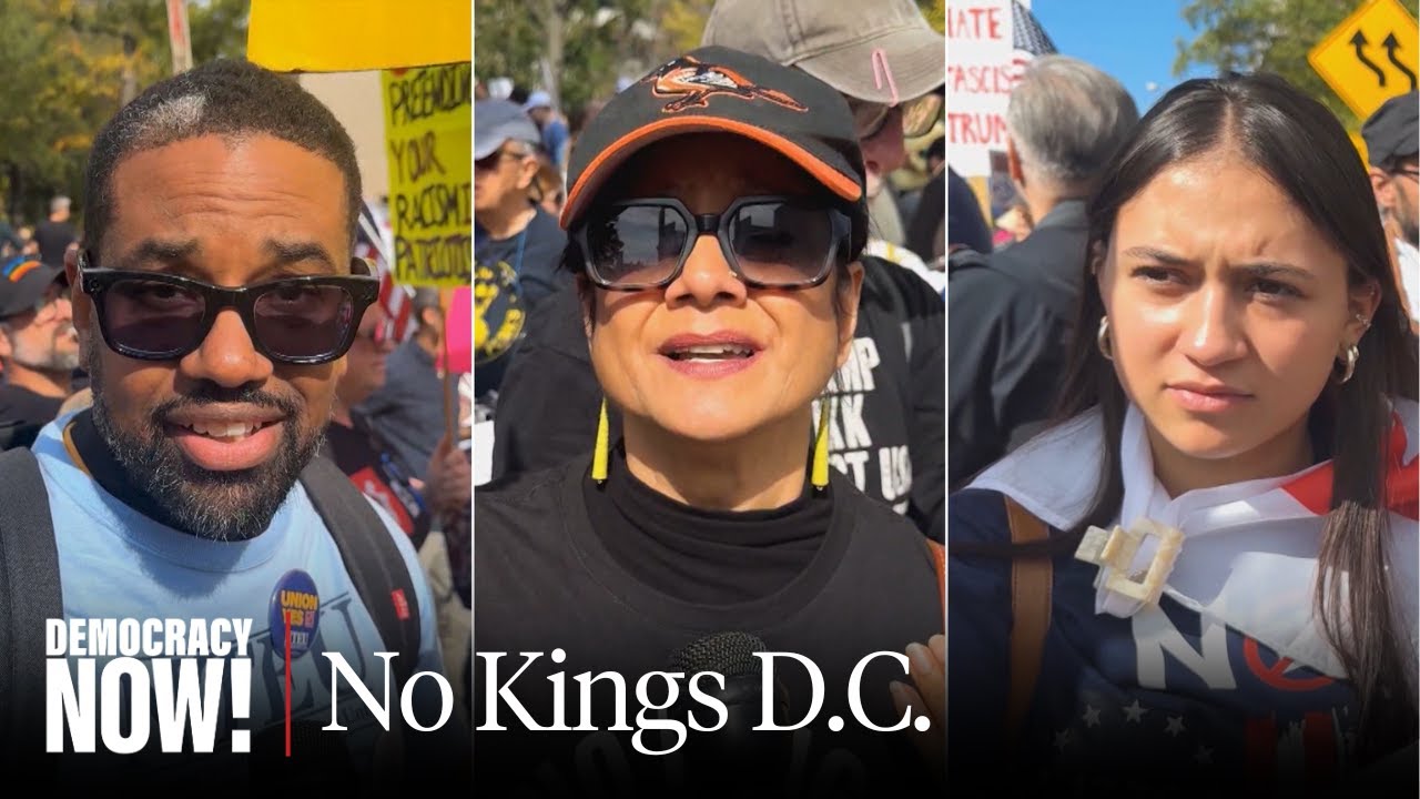 An estimated 7 million people took part in No Kings rallies Saturday to protest President Trump’s authoritarian policies. Organizers say protests were held at about 2,600 sites across all 50 states in what was one of the largest days of protest in U.S. history, surpassing the first No Kings day of action in June. One of the biggest mobilizations was in Washington, D.C., where Trump has fired thousands of federal workers and sent in National Guard troops to patrol the streets. Democracy Now! covers the action and spoke to people about what brought them out to protest.