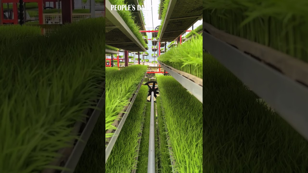 See rice seedlings efficiently cultivated on multi-layered rotating racks at a factory in Jiangxi #PeoplesDailyChina #人民日报