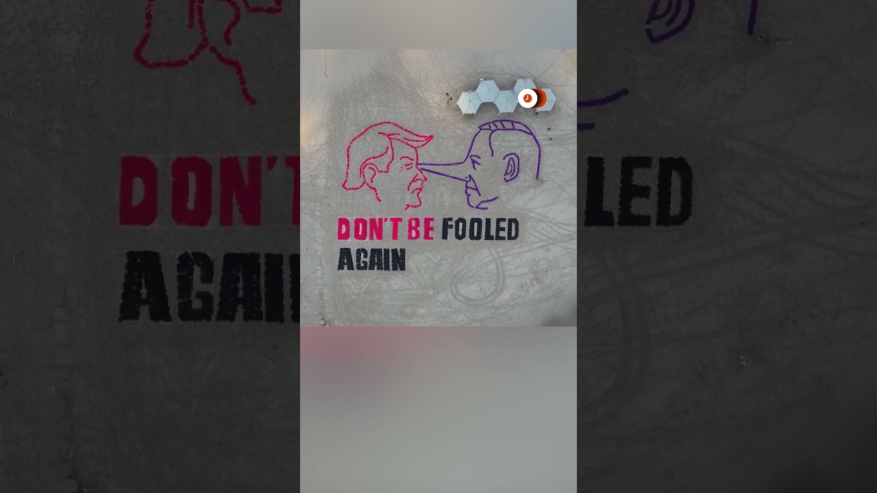 A large art installation on a beach in Tel Aviv showed images of U.S. President Donald Trump and Israeli Prime Minister Benjamin Netanyahu facing each other with the words ‘Don’t be fooled again’ in English below. In the work, Netanyahu is shown with a long nose.