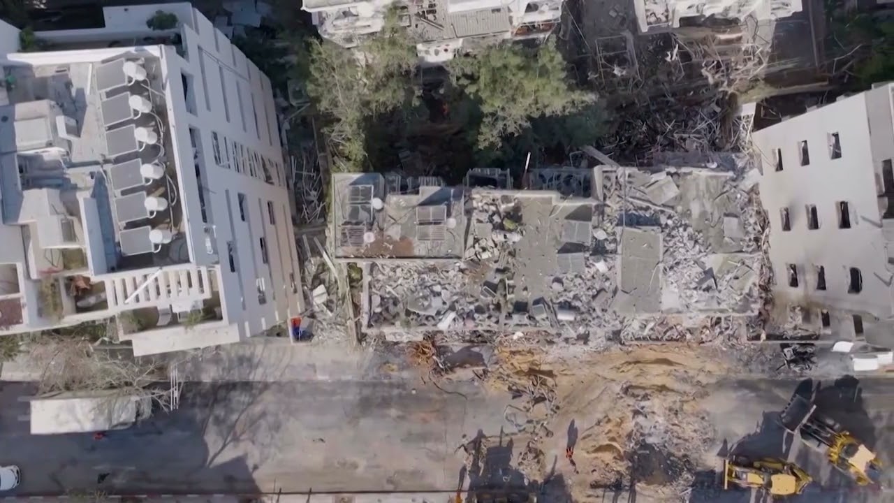 Drone footage revealed extensive damage to a residential building in Tel Aviv after a rocket launched from Iran struck the area.