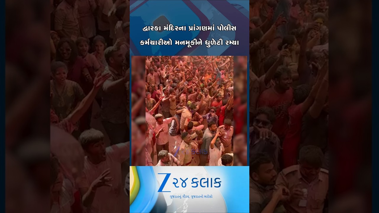 #Zee24Kalak જવાબદારી સાથે ભક્તિનો અનોખો સંગમ:જગતમંદિર દ્વારકાના પ્રાંગણમાં પોલીસ કર્મચારીઓ મનમૂકીને ધુળેટી રમ્યા