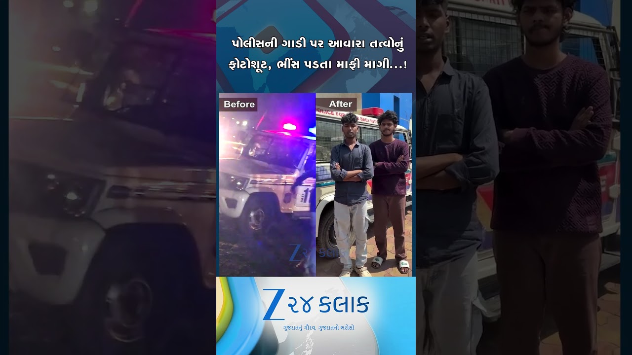 #Zee24Kalak પોલીસની ગાડી પર બેસીને ફોટોશૂટ કરાવવું મોંઘું પડ્યું, રાજકોટની ઘટનામાં યુવાનોએ બે હાથ જોડી માફી માગી