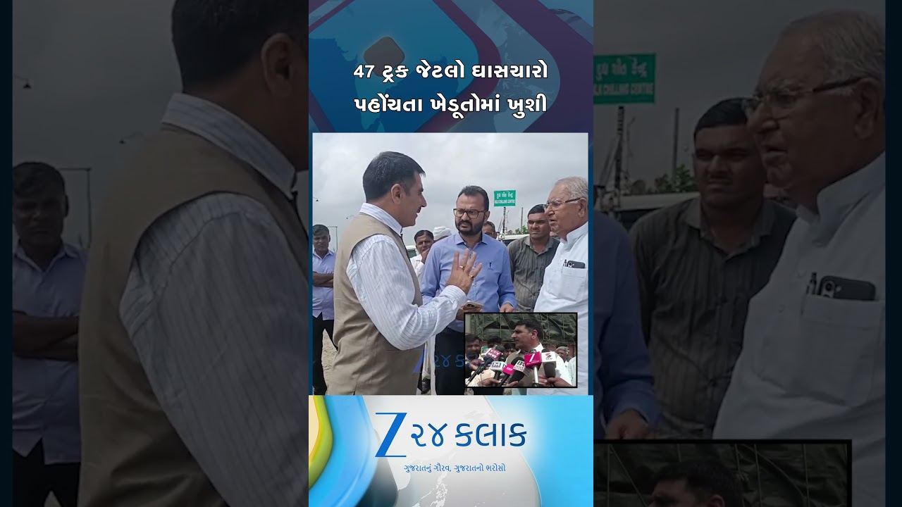 #Zee24Kalak રાજકોટથી 47 જેટલા ટ્રકો મારફતે બનાસકાંઠા પહોંચ્યો ઘાસચારો,પશુઓ માટે સૂકો ઘાસચારો પહોંચો… #shorts