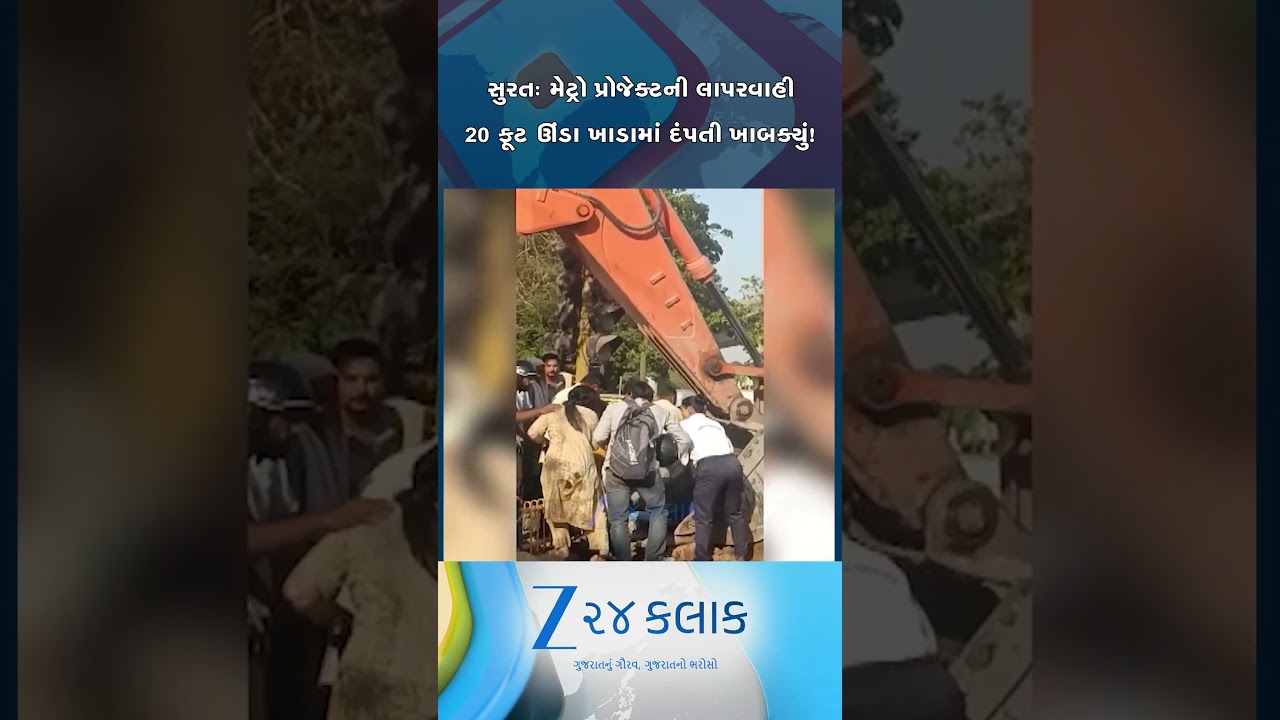 #Zee24Kalak સુરત: મેટ્રોની ગંભીર બેદરકારી; 20 ફૂટ ઊંડા ખાડામાં ખાબક્યું દંપતી, JCBની મદદથી દંપતીને બહાર કાઢયા