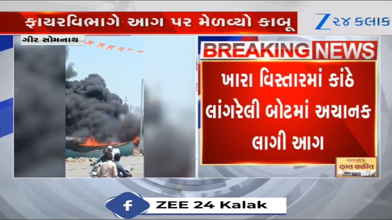 #Zee24Kalak Anchored boat catches fire on Nava Bandar of Gir-Somnath, no casualties reported; video goes viral
