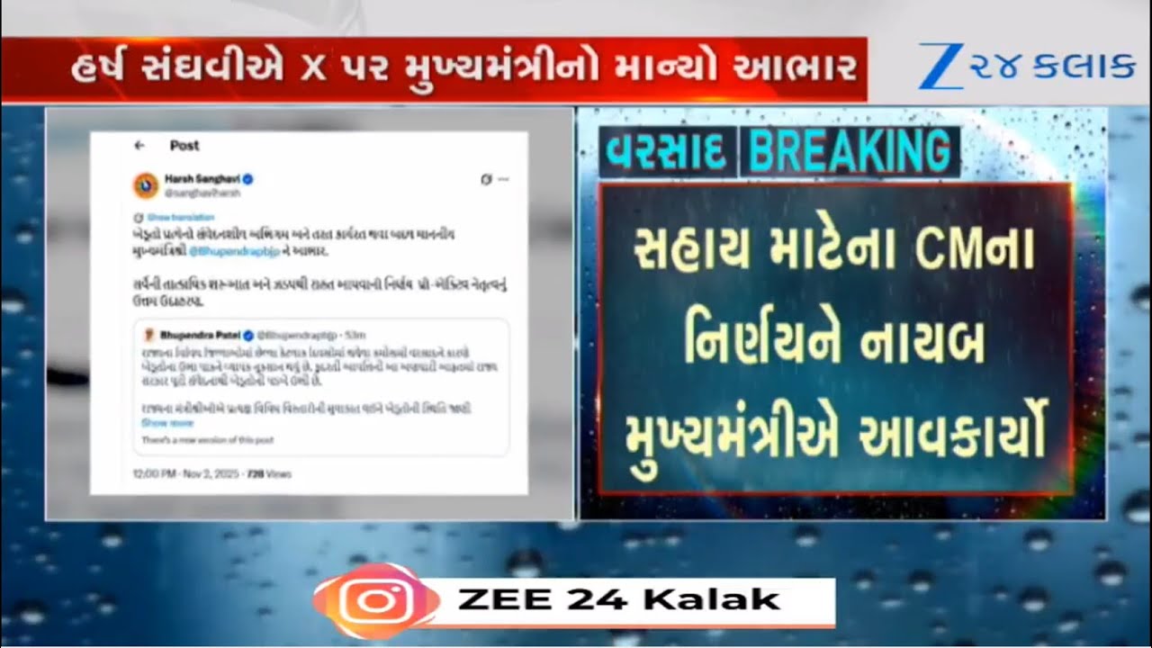 #Zee24Kalak BREAKING: સહાય માટેના CMના નિર્ણયને Dy CMએ આવકાર્યો, Harsh Sanghaviએ X પર મુખ્યમંત્રીનો માન્યો આભાર