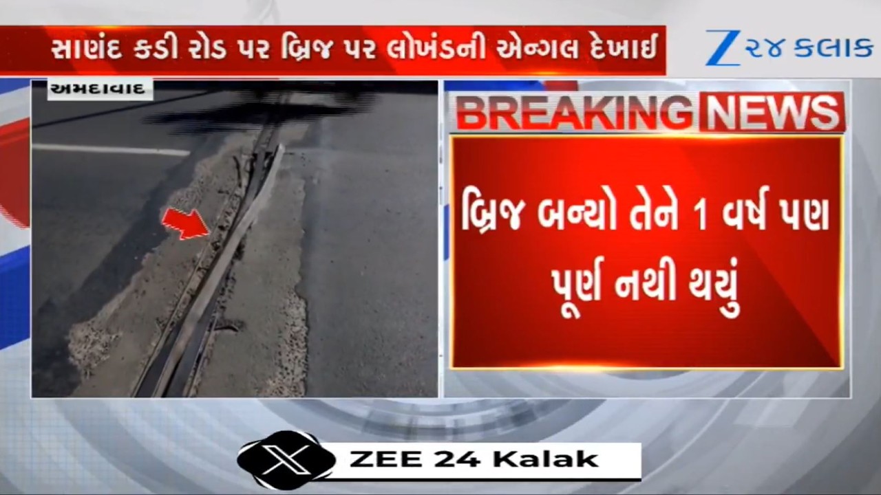 #Zee24Kalak Corruption in Constrcution! Iron Angles Protrude from New Sanand-Kadi Road Bridge Within a Year