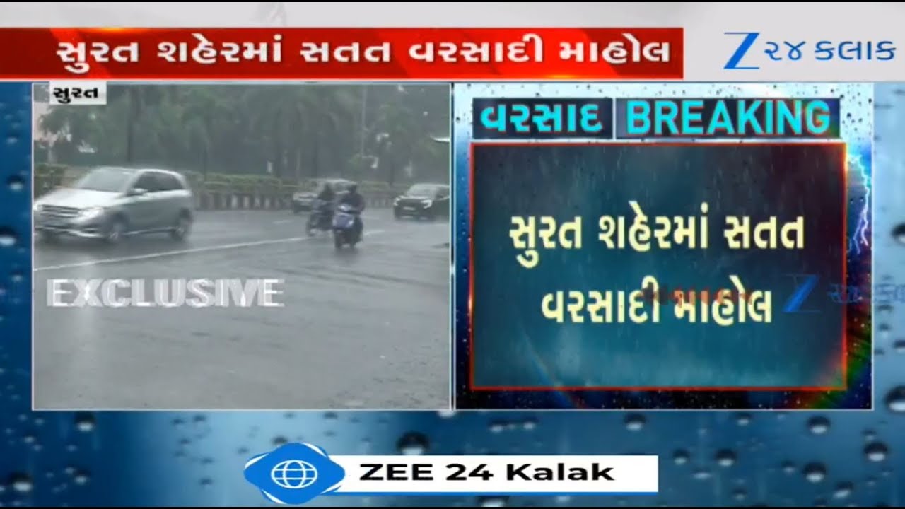 #Zee24Kalak Gujarat: Parts of Surat experiencing heavy rain showers along with gusty winds, thunderstorm
