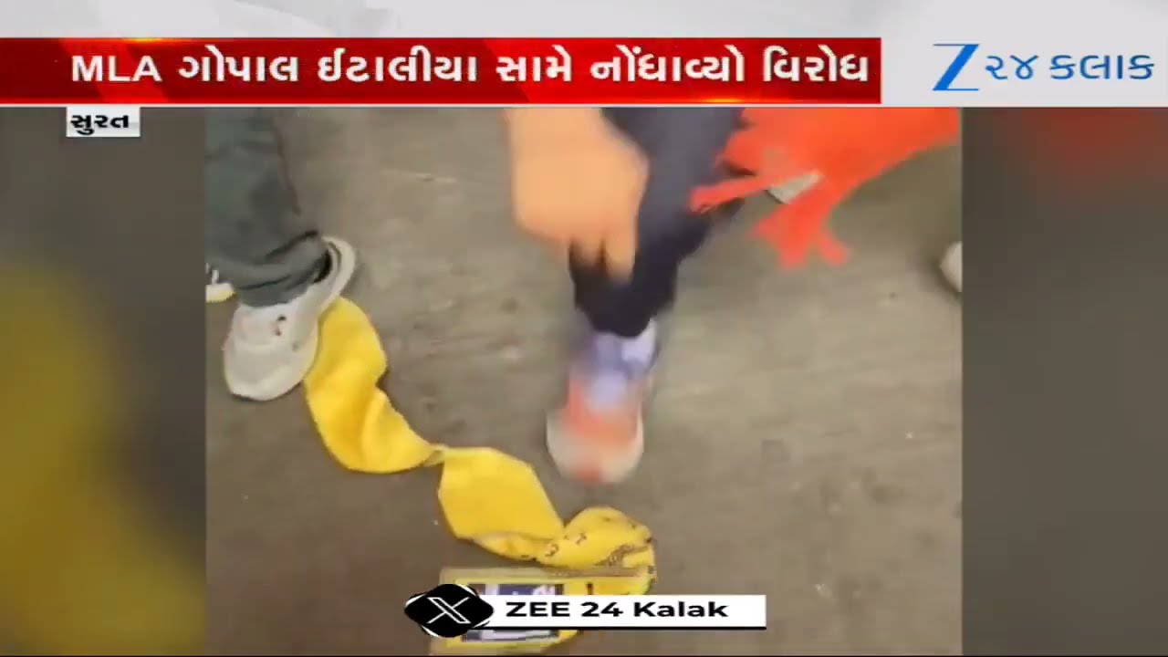 #Zee24Kalak Suratમાં ભાજપના કાર્યકરો ભૂલ્યા ભાન, આપના ખેસને પગ નીચે કચડીને નોંધાવ્યો વિરોધ